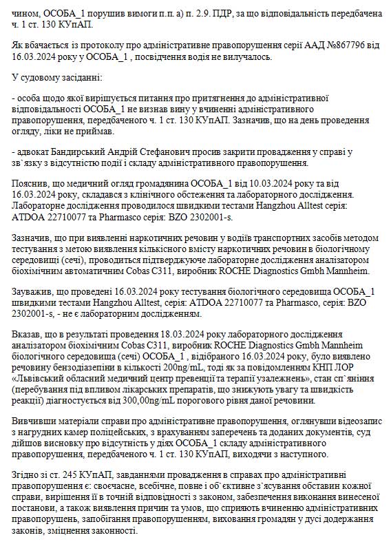 Зауважив, що проведені 16.03.2024 року тестування біологічного середовища ОСОБА_1 швидкими тестами Hangzhou Alltest, серія: ATDOA 22710077 та Pharmasco, серія: BZO 2302001-s, - не є лабораторним дослідженням.