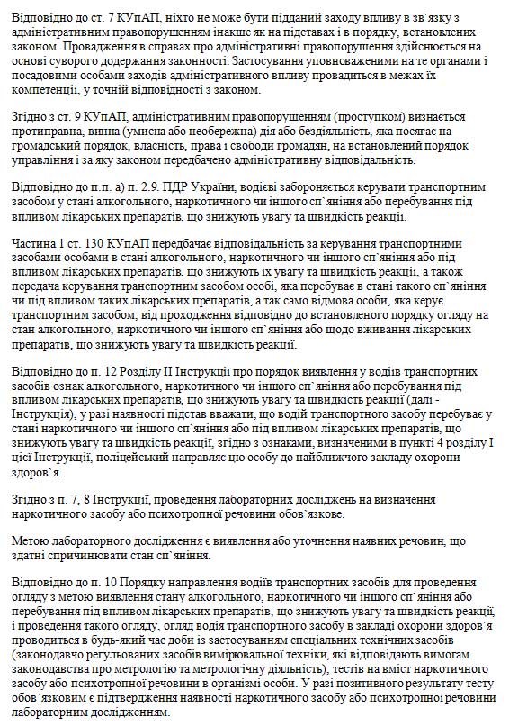 Зазначив, що при виявленні наркотичних речовин у водіїв транспортних засобів методом тестування з метою виявлення кількісного вмісту наркотичних речовин в біологічному середовищі (сечі), проводиться підтверджуюче лабораторне дослідження аналізатором біохімічним автоматичним Cobas С311, виробник ROCHE Diagnostics Gmbh Mannheim.