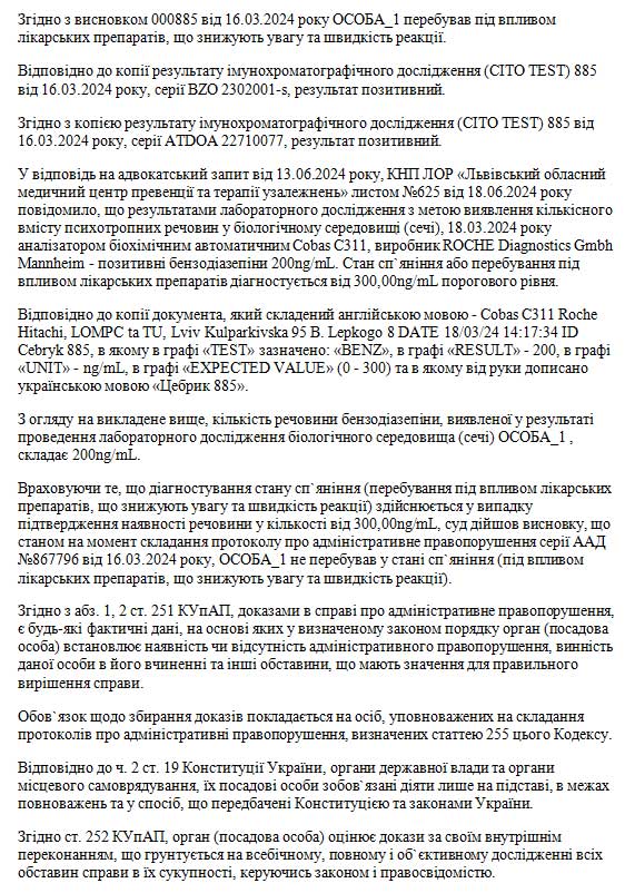 Згідно з протоколом про адміністративне правопорушення серії ААД №867796 від 16.03.2024 року, встановлено, що 16.03.2024 року о 10 год. 05 хв. у м. Львові по вул. П. Орлика, 1, водій ОСОБА_1 керував транспортним засобом «Mercedes-Benz E350», номерний знак НОМЕР_1 , під впливом лікарських препаратів, що знижують увагу та швидкість реакції, огляд проходив у встановленому законом порядку у медичному закладі КНП ЛОР «ЛОМЦПтаТУ», висновок лікаря №000885 від 16.03.2024 року. Таким чином, ОСОБА_1 порушив вимоги п.п. а) п. 2.9. ПДР, за що відповідальність передбачена ч. 1 ст. 130 КУпАП.