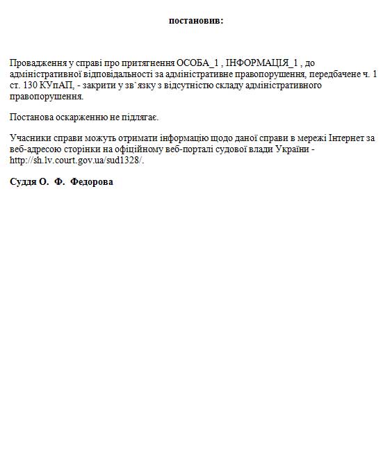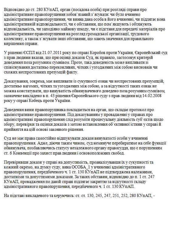 Провадження у справі про притягнення ОСОБА_1 , ІНФОРМАЦІЯ_1 , до адміністративної відповідальності за адміністративне правопорушення, передбачене ч. 1 ст. 130 КУпАП, - закрити у зв`язку з відсутністю складу адміністративного правопорушення.