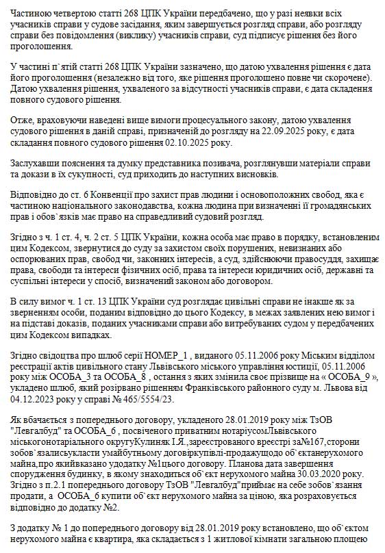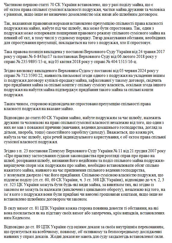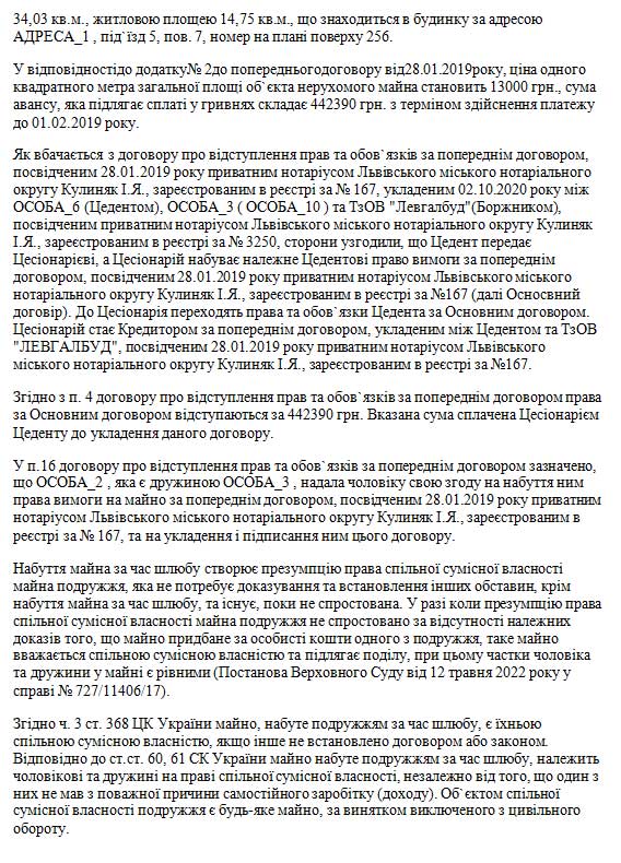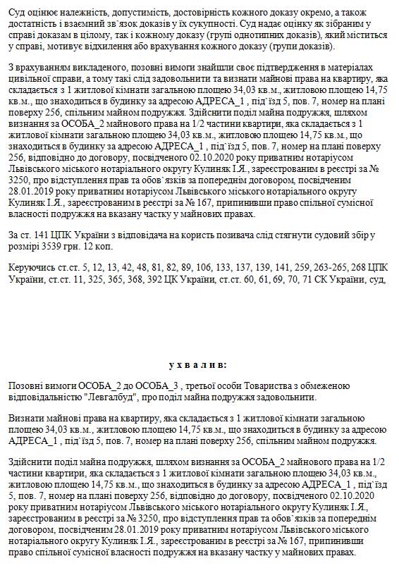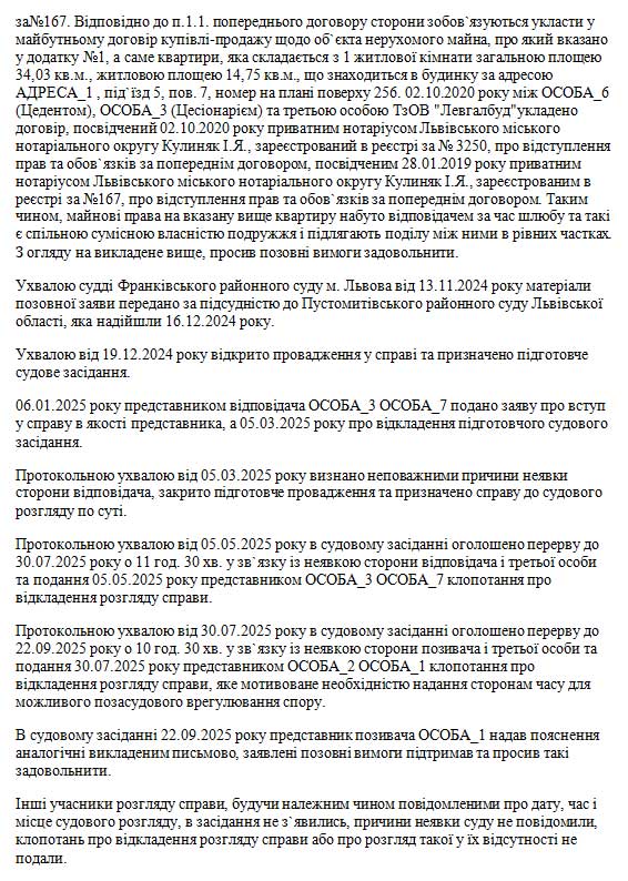 Мотивував позовнівимоги тим,що 05.11.2006року між ОСОБА_5 та ОСОБА_3 укладено шлюб,який розірванорішенням Франківськогорайонного судум.Львова від04.12.2023року усправі №465/5554/23.28.01.2019року міжтретьою особоюТзОВ «ЛЕВГАЛБУД»та ОСОБА_6 укладено попереднійдоговір,посвідчений 28.01.2019року приватнимнотаріусом Львівськогоміського нотаріальногоокругу КулинякІ.Я.,зареєстрований вреєстрі за№167. Відповідно до п.1.1. попереднього договору сторони зобов`язуються укласти у майбутньому договір купівлі-продажу щодо об`єкта нерухомого майна, про який вказано у додатку №1, а саме квартири, яка складається з 1 житлової кімнати загальною площею 34,03 кв.м., житловою площею 14,75 кв.м., що знаходиться в будинку за адресою АДРЕСА_1 , під`їзд 5, пов. 7, номер на плані поверху 256. 02.10.2020 року між ОСОБА_6 (Цедентом), ОСОБА_3 (Цесіонарієм) та третьою особою ТзОВ "Левгалбуд"укладено договір, посвідчений 02.10.2020 року приватним нотаріусом Львівського міського нотаріального округу Кулиняк І.Я., зареєстрований в реєстрі за № 3250, про відступлення прав та обов`язків за попереднім договором, посвідченим 28.01.2019 року приватним нотаріусом Львівського міського нотаріального округу Кулиняк І.Я., зареєстрованим в реєстрі за №167, про відступлення прав та обов`язків за попереднім договором. Таким чином, майнові права на вказану вище квартиру набуто відповідачем за час шлюбу та такі є спільною сумісною власністю подружжя і підлягають поділу між ними в рівних частках. З огляду на викладене вище, просив позовні вимоги задовольнити.